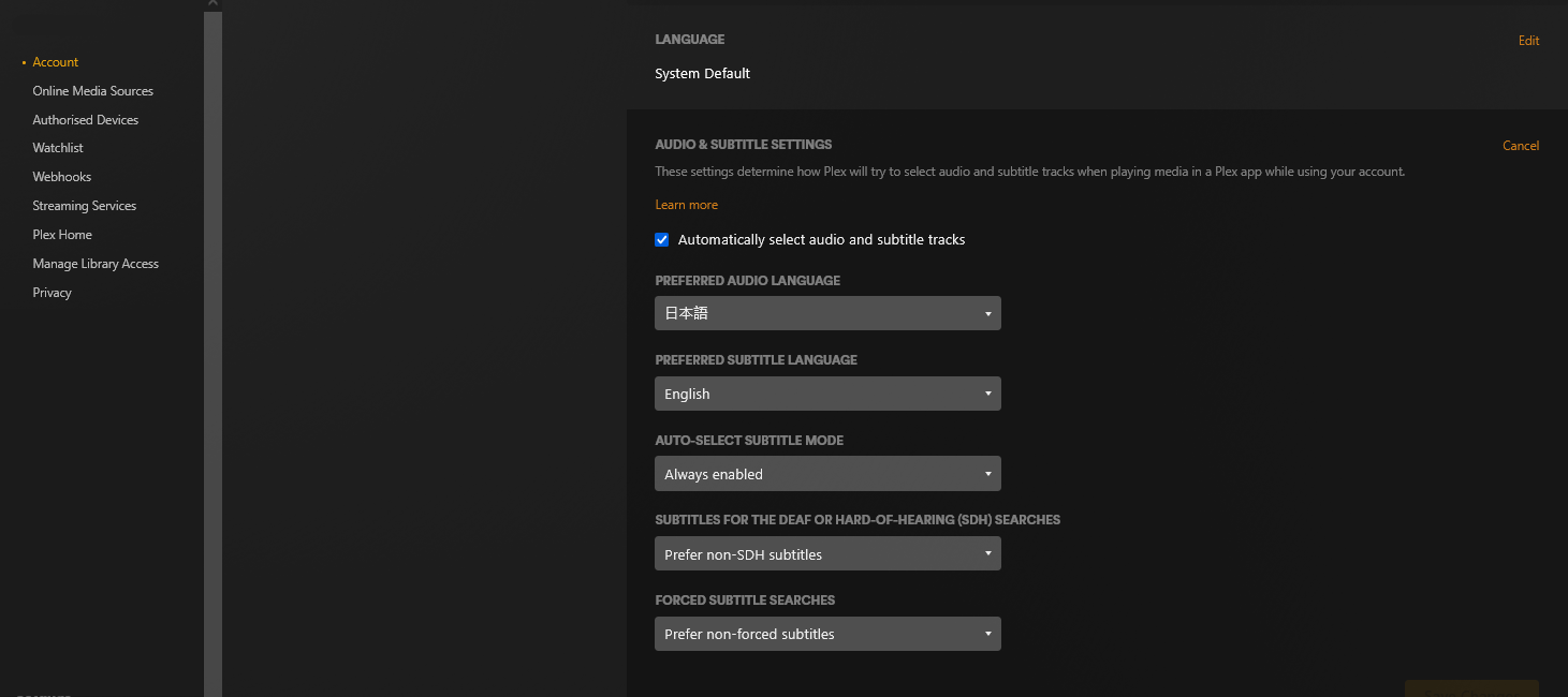 On the left go to Account and scroll down a bit until you see Audio & subtitle settings.