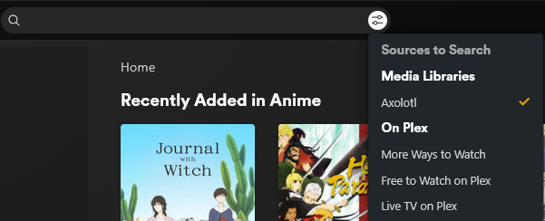 At the top of the page, when you click on the search bar, a button pops up. Click on it and uncheck everything from Plex.